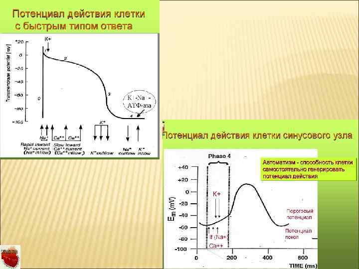 ФУНКЦИИ СЕРДЦА Автоматизм - это способность сердца вырабатывать импульсы, вызывающие возбуждение. В норме наибольшим автоматизмом обладает синусовый узел. Проводимость - способность миокарда проводить импульсы из места их возникновения до сократительного миокарда. Возбудимость - способность сердца возбуждаться под влиянием импульсов. Во время возбуждения возникает электрический ток, который регистрируется гальванометром в виде ЭКГ. Сократимость - способность сердца сокращаться под влиянием импульсов и обеспечивать функцию насоса. Рефрактерность - невозможность возбужденных клеток миокарда снова активизироваться при возникновении дополнительных импульсов. Делится на абсолютную (сердце не отвечает ни на какое возбуждение) и относительную (сердце отвечает на очень сильное возбуждение).