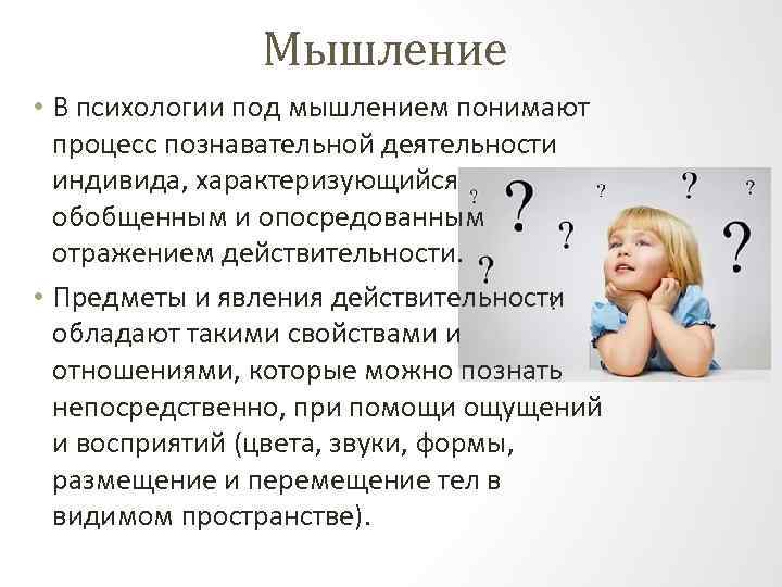 Мышление • В психологии под мышлением понимают процесс познавательной деятельности индивида, характеризующийся обобщенным и опосредованным отражением действительности. • Предметы и явления действительности обладают такими свойствами и отношениями, которые можно познать непосредственно, при помощи ощущений и восприятий (цвета, звуки, формы, размещение и перемещение тел в видимом пространстве).