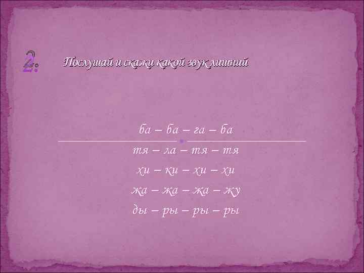 2. Послушай и скажи какой звук лишний ба – га – ба тя – ла – тя хи – ки – хи жа – жу ды – ры