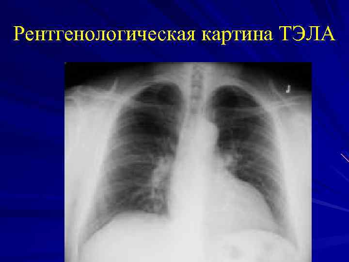 Частота физикальных признаков ТЭЛА в % Массивная ТЭЛА Шум трения плевры 57 II тон легочной артерии 60 Систолический ритм 47 галопа Влажная кожа 41 Флебит 42 Цианоз 28 ЧДД >16 87 Пульс >100 44 Лихорадка >37 градусов 42 Немассивная ТЭЛА 50 44 Средняя частота 53 53 17 34 24 21 6 - 34 33 18 -