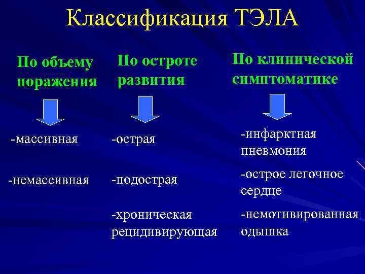 Классификация ТЭЛА По объему поражения По остроте развития По клинической симптоматике -массивная -острая -инфарктная пневмония -немассивная -подострая -острое легочное сердце -хроническая рецидивирующая -немотивированная одышка