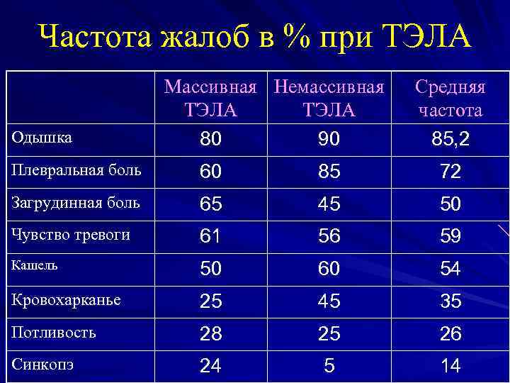 Частота жалоб в % при ТЭЛА Одышка Массивная Немассивная ТЭЛА 80 90 Средняя частота 85, 2 Плевральная боль 60 85 72 Загрудинная боль 65 45 50 Чувство тревоги 61 56 59 Кашель 50 60 54 Кровохарканье 25 45 35 Потливость 28 25 26 Синкопэ 24 5 14