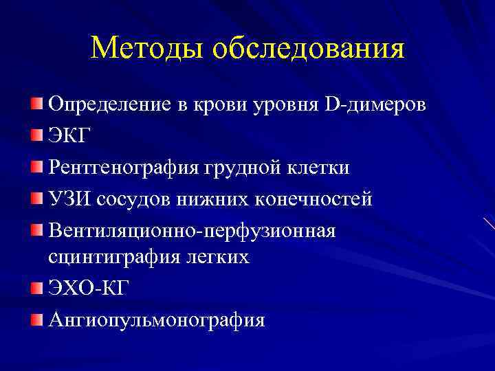 Методы обследования Определение в крови уровня D-димеров ЭКГ Рентгенография грудной клетки УЗИ сосудов нижних конечностей Вентиляционно-перфузионная сцинтиграфия легких ЭХО-КГ Ангиопульмонография