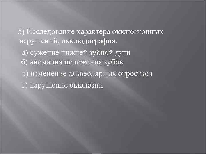 5) Исследование характера окклюзионных нарушений, окклюдография. а) сужение нижней зубной дуги б) аномалия положения зубов в) изменение альвеолярных отростков г) нарушение окклюзии