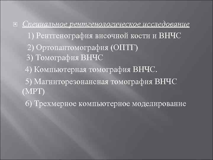 Специальное рентгенологическое исследование 1) Рентгенография височной кости и ВНЧС 2) Ортопантомография (ОПТГ) 3) Томография ВНЧС 4) Компьютерная томография ВНЧС. 5) Магниторезонансная томография ВНЧС (МРТ) 6) Трехмерное компьютерное моделирование