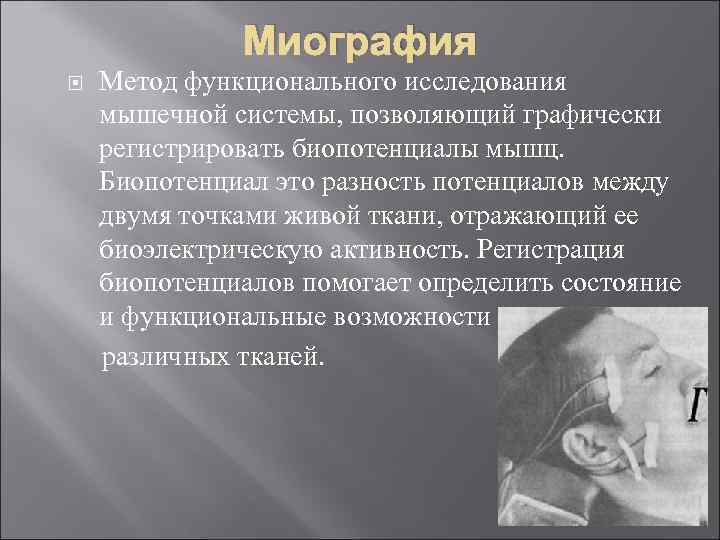 Миография Метод функционального исследования мышечной системы, позволяющий графически регистрировать биопотенциалы мышц. Биопотенциал это разность потенциалов между двумя точками живой ткани, отражающий ее биоэлектрическую активность. Регистрация биопотенциалов помогает определить состояние и функциональные возможности различных тканей.