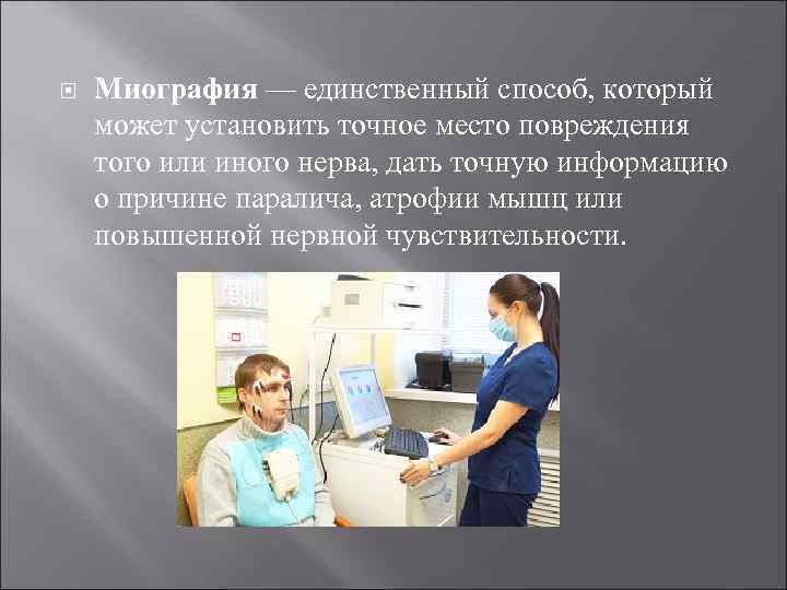 Миография — единственный способ, который может установить точное место повреждения того или иного нерва, дать точную информацию о причине паралича, атрофии мышц или повышенной нервной чувствительности.