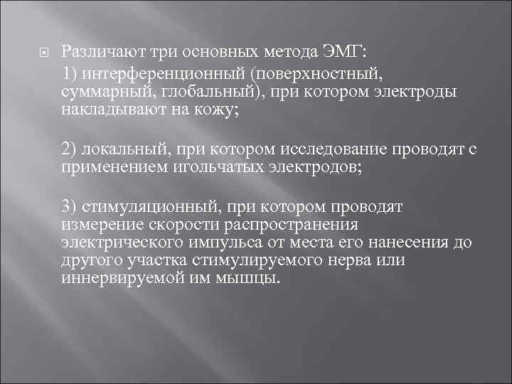 Различают три основных метода ЭМГ: 1) интерференционный (поверхностный, суммарный, глобальный), при котором электроды накладывают на кожу; 2) локальный, при котором исследование проводят с применением игольчатых электродов; 3) стимуляционный, при котором проводят измерение скорости распространения электрического импульса от места его нанесения до другого участка стимулируемого нерва или иннервируемой им мышцы.