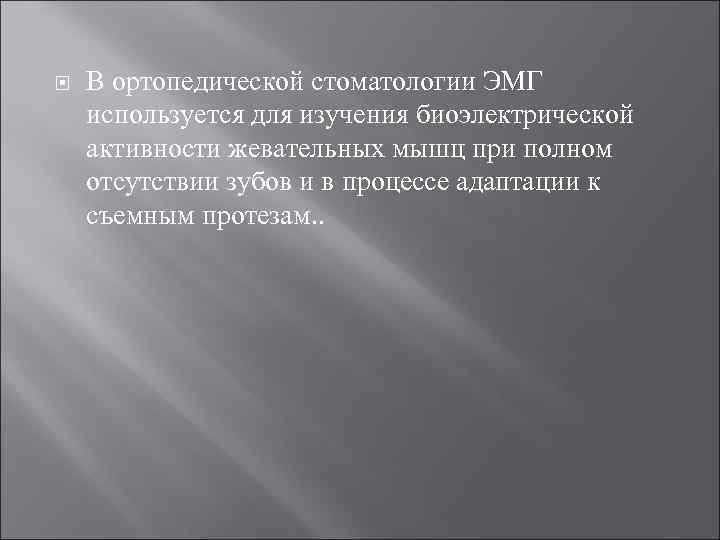 В ортопедической стоматологии ЭМГ используется для изучения биоэлектрической активности жевательных мышц при полном отсутствии зубов и в процессе адаптации к съемным протезам. .