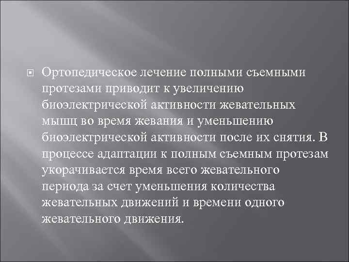 Ортопедическое лечение полными съемными протезами приводит к увеличению биоэлектрической активности жевательных мышц во время жевания и уменьшению биоэлектрической активности после их снятия. В процессе адаптации к полным съемным протезам укорачивается время всего жевательного периода за счет уменьшения количества жевательных движений и времени одного жевательного движения.