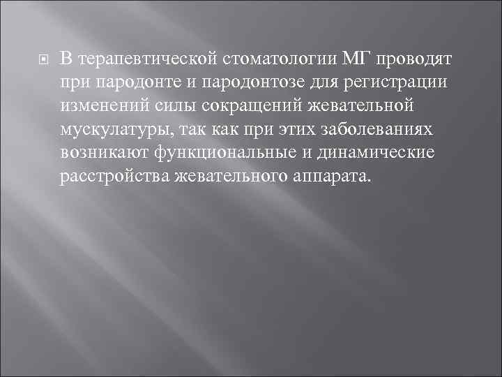 В терапевтической стоматологии МГ проводят при пародонте и пародонтозе для регистрации изменений силы сокращений жевательной мускулатуры, так как при этих заболеваниях возникают функциональные и динамические расстройства жевательного аппарата.