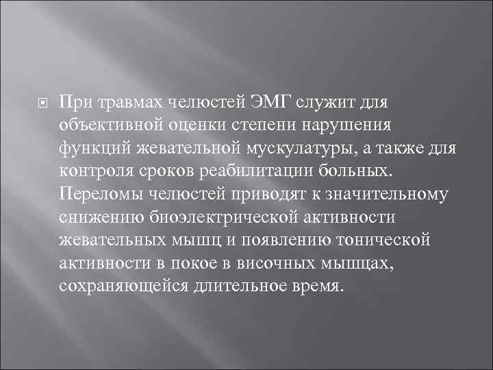 При травмах челюстей ЭМГ служит для объективной оценки степени нарушения функций жевательной мускулатуры, а также для контроля сроков реабилитации больных. Переломы челюстей приводят к значительному снижению биоэлектрической активности жевательных мышц и появлению тонической активности в покое в височных мышцах, сохраняющейся длительное время.