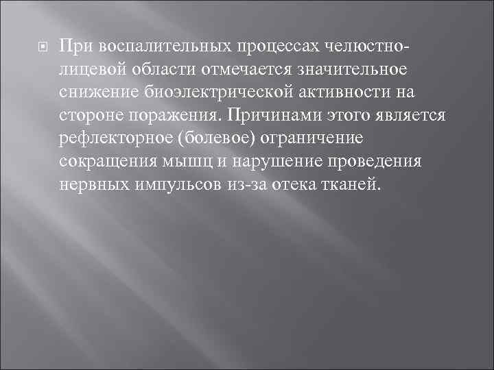При воспалительных процессах челюстнолицевой области отмечается значительное снижение биоэлектрической активности на стороне поражения. Причинами этого является рефлекторное (болевое) ограничение сокращения мышц и нарушение проведения нервных импульсов из-за отека тканей.