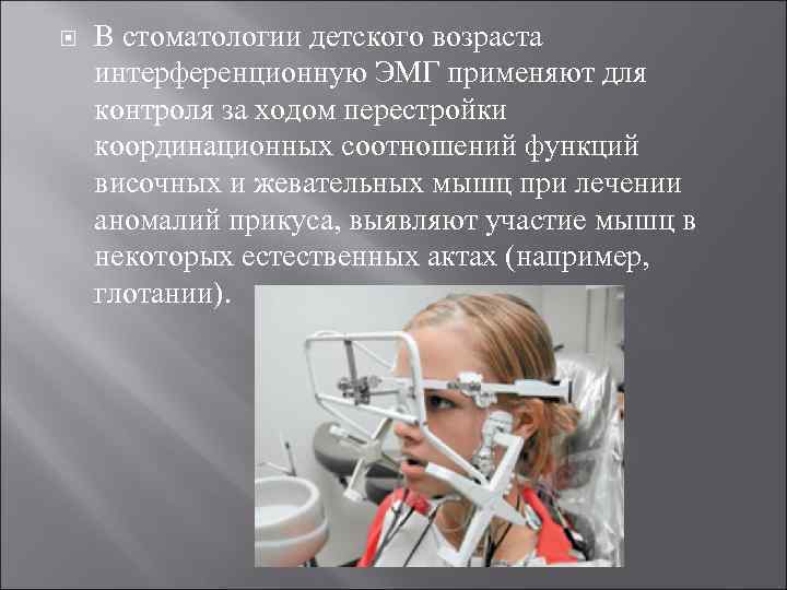 В стоматологии детского возраста интерференционную ЭМГ применяют для контроля за ходом перестройки координационных соотношений функций височных и жевательных мышц при лечении аномалий прикуса, выявляют участие мышц в некоторых естественных актах (например, глотании).