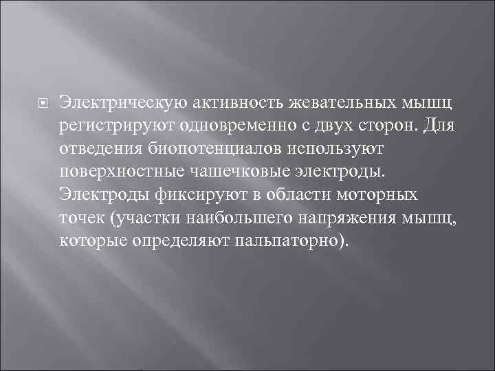 Электрическую активность жевательных мышц регистрируют одновременно с двух сторон. Для отведения биопотенциалов используют поверхностные чашечковые электроды. Электроды фиксируют в области моторных точек (участки наибольшего напряжения мышц, которые определяют пальпаторно).