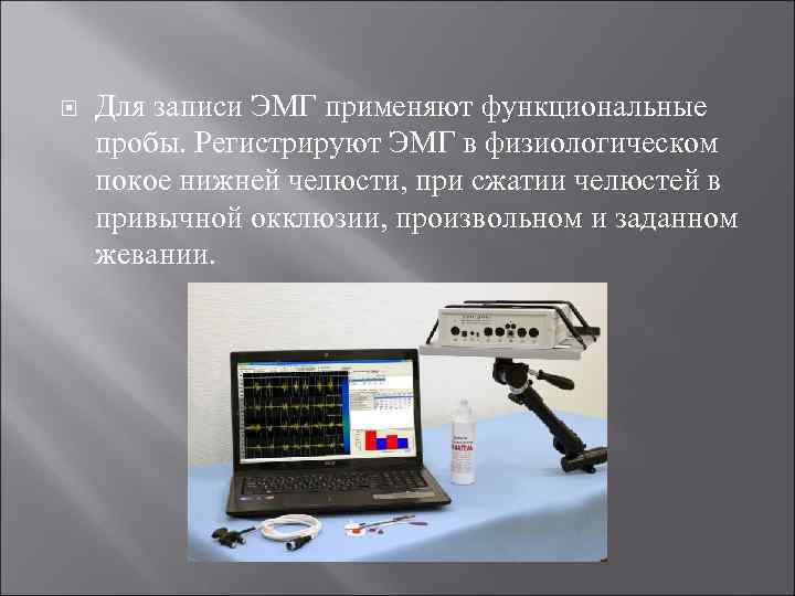 Для записи ЭМГ применяют функциональные пробы. Регистрируют ЭМГ в физиологическом покое нижней челюсти, при сжатии челюстей в привычной окклюзии, произвольном и заданном жевании.