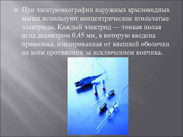 При электромиографии наружных крыловидных мышц используют концентрические игольчатые электроды. Каждый электрод — тонкая полая игла диаметром 0, 45 мм, в которую введена проволока, изолированная от внешней оболочки на всем протяжении за исключением кончика.