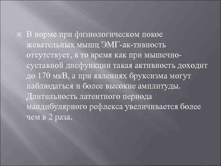 В норме при физиологическом покое жевательных мышц ЭМГ-ак-тивность отсутствует, в то время как при мышечносуставной дисфункции такая активность доходит до 170 мк. В, а при явлениях бруксизма могут наблюдаться и более высокие амплитуды. Длительность латентного периода мандибулярного рефлекса увеличивается более чем в 2 раза.
