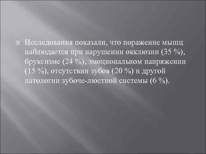 Исследования показали, что поражение мышц наблюдается при нарушении окклюзии (35 %), бруксизме (24 %), эмоциональном напряжении (15 %), отсутствии зубов (20 %) и другой патологии зубоче-люстной системы (6 %).