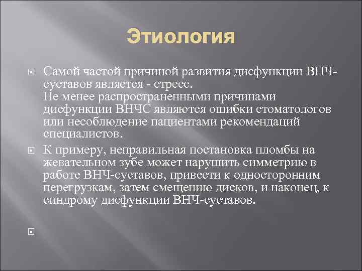 Этиология Самой частой причиной развития дисфункции ВНЧсуставов является - стресс. Не менее распространенными причинами дисфункции ВНЧС являются ошибки стоматологов или несоблюдение пациентами рекомендаций специалистов. К примеру, неправильная постановка пломбы на жевательном зубе может нарушить симметрию в работе ВНЧ-суставов, привести к односторонним перегрузкам, затем смещению дисков, и наконец, к синдрому дисфункции ВНЧ-суставов.