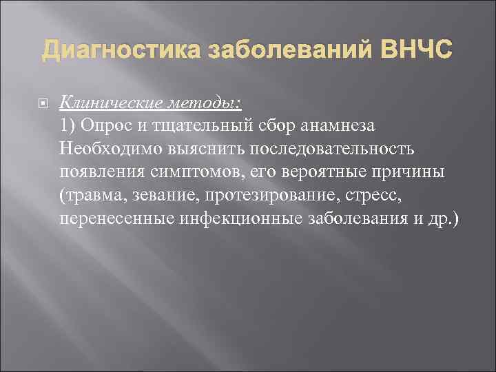Диагностика заболеваний ВНЧС Клинические методы: 1) Опрос и тщательный сбор анамнеза Необходимо выяснить последовательность появления симптомов, его вероятные причины (травма, зевание, протезирование, стресс, перенесенные инфекционные заболевания и др. )