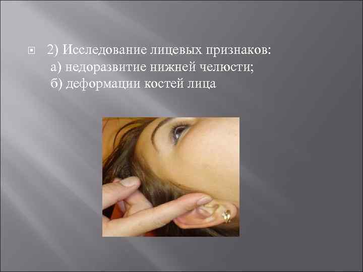 2) Исследование лицевых признаков: а) недоразвитие нижней челюсти; б) деформации костей лица