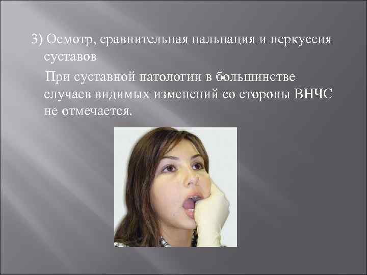 3) Осмотр, сравнительная пальпация и перкуссия суставов При суставной патологии в большинстве случаев видимых изменений со стороны ВНЧС не отмечается.