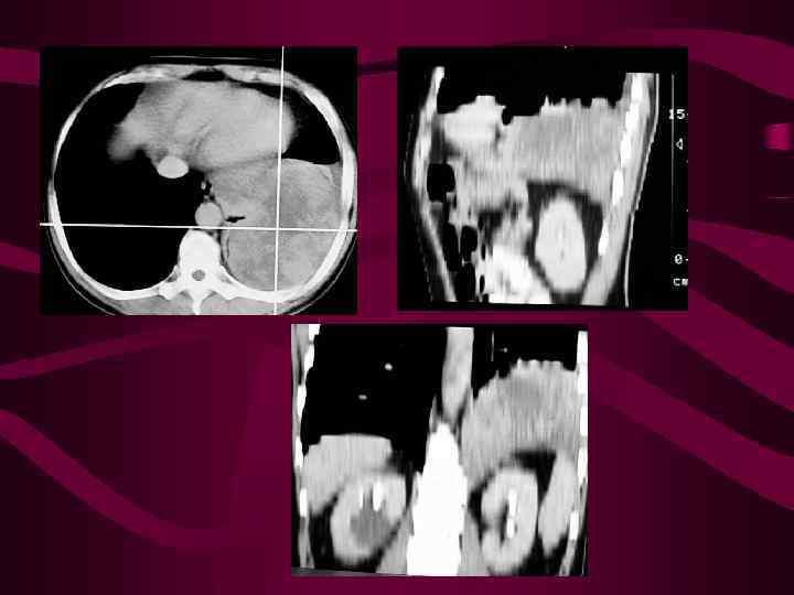 КТ Денситометрические характеристики эхинококковой кисты постепенно изменяются: из гиподенсивной она становиться гетерогенной или гиперденсивной. Характерным является обызвествление капсулы - свидетельство гибели паразита. Иногда наблюдается описанный В. Н. Штерном специфический для эхинококковой кисты симптом отслойки капсулы.