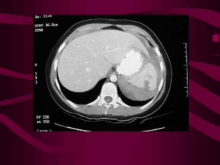 Методы визуализации Р-графия живота – смещение газового пузыря медиально и левой почки книзу. УЗИ – гипоэхогенный участок на периферии , реже – округлой формы (тогда неотличим от опухолей и абсцессов) КТ – Очаги низкой плотности, клиновидной формы, расположенные под капсулой, более четкие границы после в/в контрастирования ( не копят КВ) Реже инфаркты могут иметь вид продолговатых, округлых или дольчатых участков низкой плотности с нечеткими контурами. Сосуды капсулы обеспечивают кровоток по прериферии, что при КТ с усилением проявляется как симптом «кортикального пояска» Нередко может быть недольшое скопление жидкости вокруг С. Исходы: фиброз, киста, обызвествление