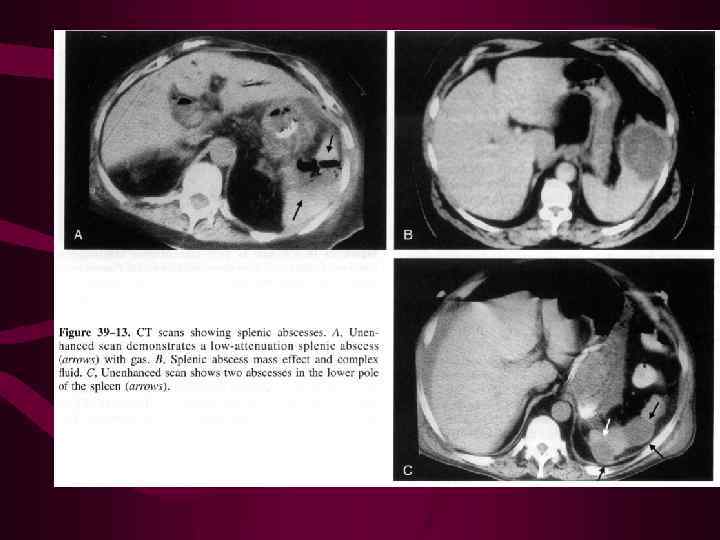 АБСЦЕССЫ СЕЛЕЗЕНКИ формируются в результате: 1) гематогенной диссеминации при эндокардите, сепсисе, тифе, малярии, туберкулезе, гистоплазмозе, кандидозе, бруцелезе 2) распространении инфекции с соседних тканей 3) вторичного инфицирования посттравматических гематом. Чаще болеют наркоманы. В 80% случаев абсцессы селезенки сочетаются с абсцессами других органов.