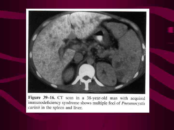 Клиника. Лихорадка, боль в животе, умеренная спленомегалия, может быть напряжение мышц в левом верхнем квадранте живота Лабораторные исследование – классические признаки инфекции. Р- может быть смещение желудка медиально, почки каудально, в 30% м. б. фиксированные пузырьки газа в проекции селезенки Нередко обнаруживают очаги обызвествления в виде мелких крапинок (милиарный туберкулез), более крупные очаги, групповые очаги (туберкулез, бруцелез, гистоплазмоз), обызвествление в виде концентрических пластов - при бруцелезе.