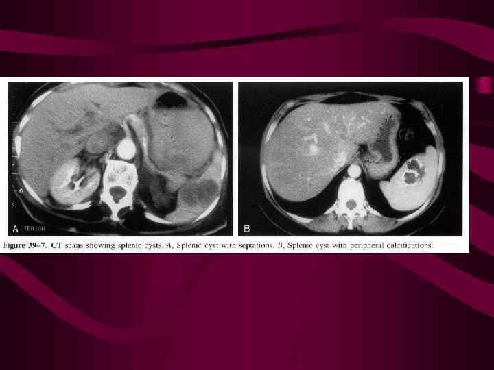 КИСТЫ СЕЛЕЗЕНКИ делят на истинные, ложные, паразитарные и опухолевые Истинная киста является врожденной, это тонкостенный мешок, выстланный эндотелием. Плотность жидкостная (от – 5 до +10 HU), размеры варьируют от 1 -2 см до 30 см и более. Могут быть единичные и множественные. Ложные кисты - следствие перенесенного травматического или спонтанного кровотечения Паразитарные кисты (чаще эхинококковые) на ранних стадиях дают такую же картину, что и непаразитарные.