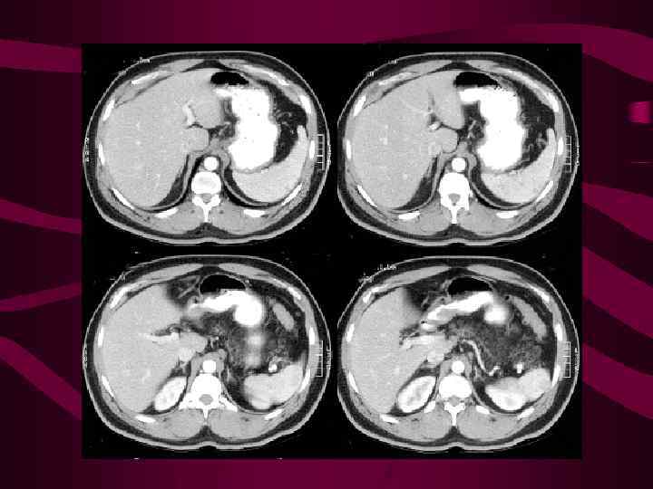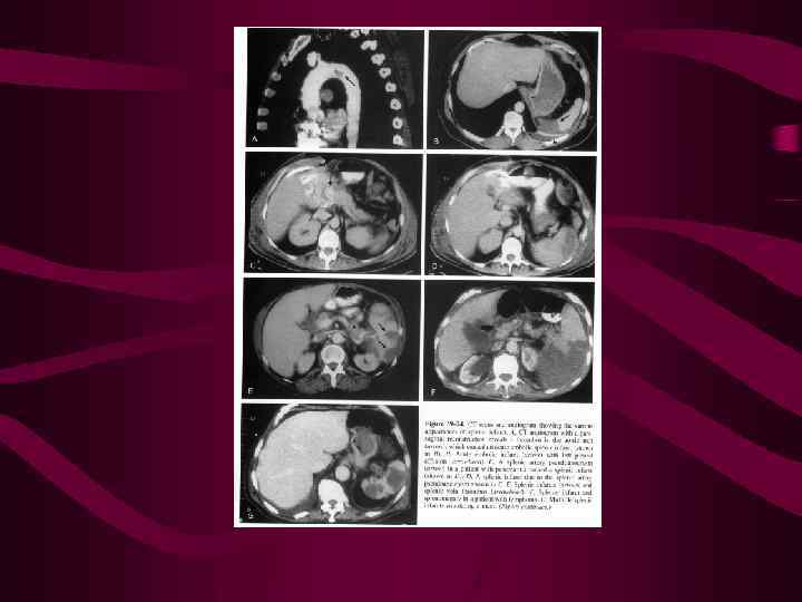 Изменение структуры селезенки (фокусы пониженной эхогенности/плотности, 1 -3 см в диаметре) у больных с гемобластозами вызвано как специфической лейкозной инфильтрацией, так и токсическим воздействием цитостатиков, в воротах по ходу селезеночной вены определяются увеличенные л/у Дополнительную информацию можно получить с помощь. Динамической КТ после в/венного введения КВ МРТ в некоторых случаях может быть более информативной с использованием супермагнитного оксида железа в качестве КВ, который накапливается в ретикуло-эндотелиальных клетках
