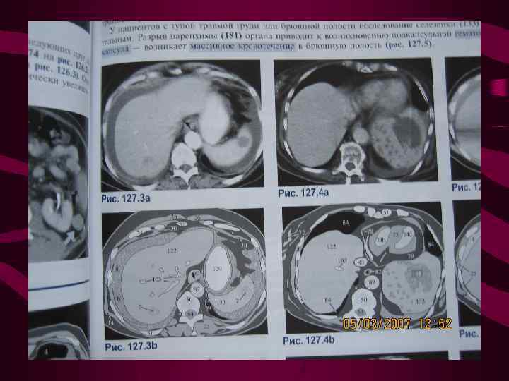 Клиника. Боль в левом верхнем квадранте живота, в 50% боль в левом плечевом суставе (симптом Кера). Обильное кровотечение сопровождается картиной гиповолемического шока. Рентгенограмма брюшной полости- косвенные признаки увеличения селезенки УЗИ – сочетание гипо- и гиперэхогенных дефектов, выходящих за пределы капсулы + свободная жидкость вокруг селезенки = косвенные признаки травмы КТ выявляет дефекты паренхимы в виде участков высокой и низкой плотности и жидкости высокой плотности вокруг селезенки - признак кровотечения.