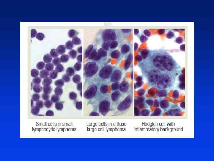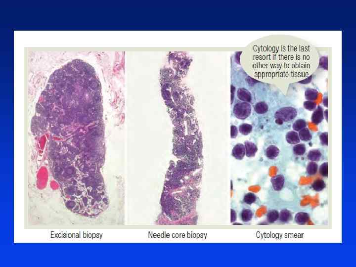l Podejrzane (powiększone) węzły chłonne powinny być poddane biopsji, preferencyjnie przy zastosowaniu biopsji wycinającej l Biopsja cienkoigłowa nie powinna być raczej zalecana ze względu na duży odsetek wyników fałszywie negatywnych l Węzły chłonne większe niż 1. 5 cm są uważane za nieprawidłowe