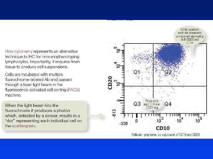 Diagnoza l Precyzyjną diagnozę można postawić przy pomocy tzw. cytometrii przepływowej – Węzły chłonne – Szpik kostny – Płyn mózgowo-rdzeniowy l Patologiczne limfocyty można także wykryć w krwi obwodowej, jednak należy zastosować specjalne techniki analizy molekularnej