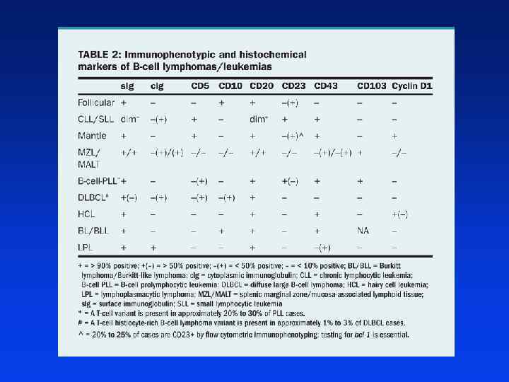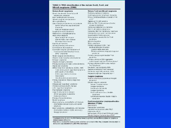 Klasyfikacja l Klasyfikacja REAL / WHO - 3 grupy nowotworów układu chłonnego: z komórek B, T / NK oraz ziarnicę złośliwą - nowotwory z komórek B i T dzielą się na - prekursorowe (limfoblastyczne) - dojrzałe – „obwodowe” -