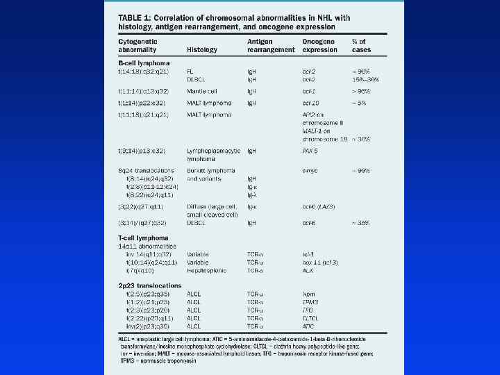 Etiologia i czynniki ryzyka l Aberracje chromosomalne i inne zaburzenia molekularne odgrywają istotną rolę w patogenezie wielu chłoniaków złośliwych i korelują z ich obrazem histologicznym i immunofenotypowym l Czynniki środowiskowe l Wirusy (np. EBV, HTLV-1, HHV-8, HCV) l Infekcje bakteryjne (np. Helicobacter pylori, Borrelia burgdorferi, Campylobacter jejuni, Chlamydia psittaci) l Wrodzone i nabyte stany niedoborów odporności (HIV) l Czynniki związane ze stylem życia l Czynniki genetyczne