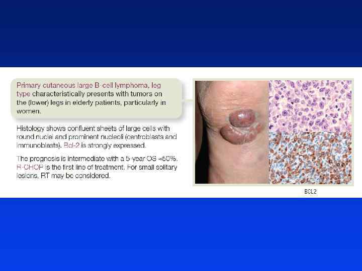 DLBCL l Najczęstsze chłoniaki nieziarnicze w Polsce l Mediana wieku chorych 60 -70 lat l Szybko powiększające się niebolesne obwodowe węzły chłonne lub masa w narządzie pozalimfatycznym l 60% chorych w III lub IV stopniu zaawansowania l Mogą być obecne objawy ogólne l Mogą być zajęte okolice pozalimfatyczne (40% przypadków): przewód pokarmowy (najczęściej żołądek), rzadziej kości, gruczoły piersiowe, jądra, OUN, tarczyca, wątroba i nerki l Zajęcie szpiku kostnego 11%-27% przypadków