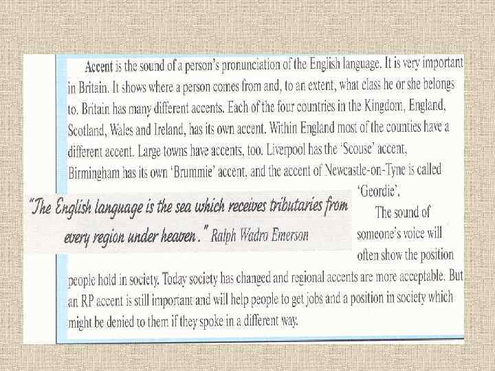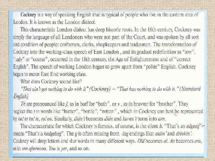 • В настоящее время на RP говорят всего 5% населения Британии. • Но! При этом теряются диалекты. «Наступает» Standard English • Причины: -урбанизация; • - образование • - mass media