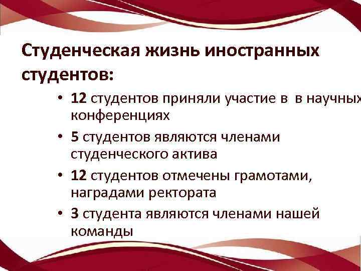 Студенческая жизнь иностранных студентов: • 12 студентов приняли участие в в научных конференциях • 5 студентов являются членами студенческого актива • 12 студентов отмечены грамотами, наградами ректората • 3 студента являются членами нашей команды