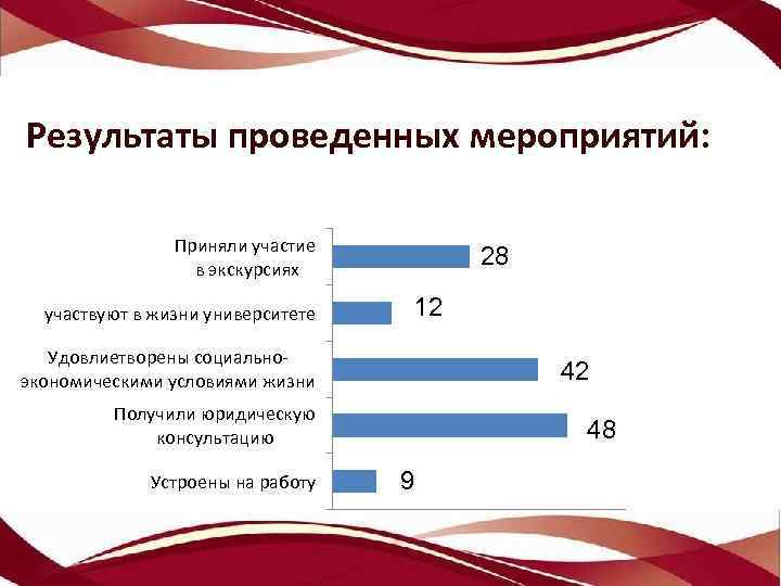 Результаты проведенных мероприятий: Приняли участие в экскурсиях 28 12 участвуют в жизни университете Удовлиетворены социальноэкономическими условиями жизни 42 Получили юридическую консультацию 48 9 Устроены на работу 0 20 40 60
