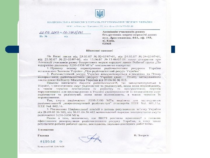 Сертифицированное оборудование в диапазоне 5 ГГц – l l Air. Mux-200 p-t-p Win. Link-1000 p-t-p – l l l Оборудование класса «pre. Wimax» ORINOCO AP-4000 (Proxim)802. 11 a Tsunami MP. 11 (Proxim)802. 11 a – l Оборудование для каналов ТОЧКА-ТОЧКА Оборудование 802. 16 Air. Span 802. 16 ИНФИНЕТ R-5000/O/S/L РЭС «РАПИРА» 802. 16 Axxcelera 802. 16 – Оборудование BWA l Aperto Packet. Wave l ПОКА НЕ БУДЕТ ИЗМЕНЕНИЙ В ПЛАНЕ РЧР УКРАИНЫ, ЗАЯВКИ НА ВНЕСЕНИЕ В РЕЕСТР НКРС НЕ ПРИНИМАЮТСЯ