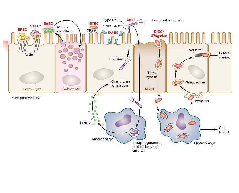 В норме на энтероцитах Tir-рецептора нет. Однако он присутствует в бактериальной клетке. После контакта E. сoli с клетками эпителия тонкой кишки с помощью инжектисомы происходит впрыскивание белков, составляющих Tir-рецептор к интимину, внутрь эпителиоцита. Через некоторое время этот рецептор появляется на мембране энтероцита. E. сoli посредством интимина присоединяется к внедренному Tirрецептору. Это обеспечивает прочную адгезию микроба с поверхностью эпителиальных клеток. Кроме того, Tir-рецептор активирует перестройку внутриклеточного актина и других белков в месте прикрепления микробов. В результате после присоединения большого количества бактерий происходит сглаживание и стирание микроворсинок эпителия кишечника. При этом может развиваться локальное воспаление. Все это ведет к нарушению всасывания, расстройству электролитного обмена и диарее.