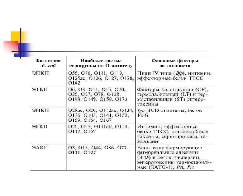 Лабораторная диагностика q Ø Ø Ø Ø О-антигенная характеристика изолята E. coli в бактериологическом исследовании не во всех случаях четко коррелирует с наличием у него факторов вирулентности, определяющим принадлежность к одной из шести групп диарогенных эшерихий. Прямыми критериями отнесения E. coli к патогенетическим группам являются ключевые факторы вирулентности, наиболее охарактеризованные из которых представлены ниже. Для EHEC – продукция шигаподобных токсинов (веротоксинов) 1 и/или 2 типа, в сочетании с наличием интимина (eae-ген) или без него; Для ЕТЕС – продукция термостабильного (ST) или термолабильного (LT) токсинов, Для ЕРЕС – наличие так называемого А/Е (attaching and effacing) эффекта, обеспечиваемого интимином (eae – ген) при отсутствии генов шигаподобных токсинов, Для EIEC- наличие плазмидных генов факторов вирулентности (inv, ipa и др. ), Для EAg. EC – наличие плазмидных генов факторов вирулентности agg. R, asp. U, Для DAEC – afa – afimbrial factors adhesins, daa – DAEC F 1845 fimbriae и др.