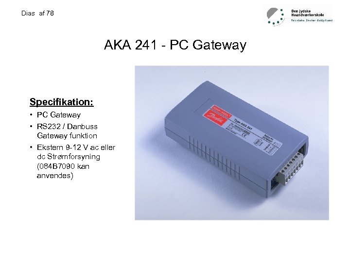 Dias af 78 AKA 241 - PC Gateway Specifikation: • PC Gateway • RS 232 / Danbuss Gateway funktion • Ekstern 9 -12 V ac eller dc Strømforsyning (084 B 7090 kan anvendes)