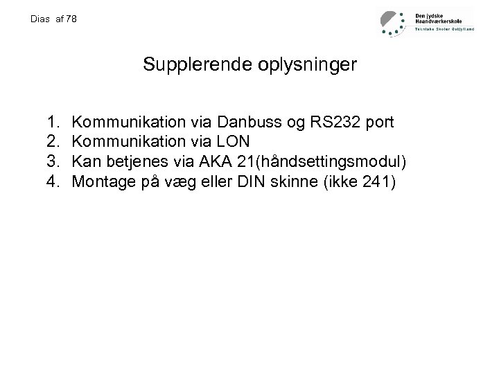 Dias af 78 Supplerende oplysninger 1. 2. 3. 4. Kommunikation via Danbuss og RS 232 port Kommunikation via LON Kan betjenes via AKA 21(håndsettingsmodul) Montage på væg eller DIN skinne (ikke 241)