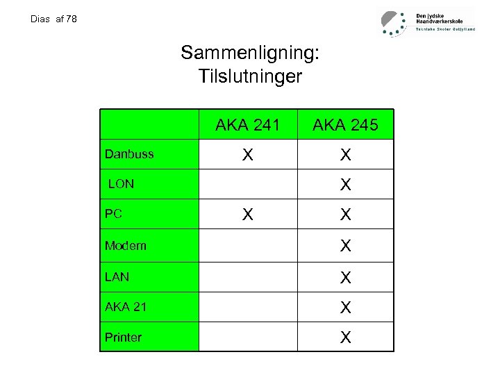 Dias af 78 Sammenligning: Tilslutninger AKA 241 Danbuss AKA 245 X X X LON PC X X Modem X LAN X AKA 21 X Printer X