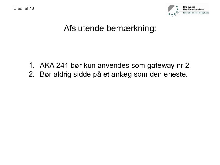 Dias af 78 Afslutende bemærkning: 1. AKA 241 bør kun anvendes som gateway nr 2. 2. Bør aldrig sidde på et anlæg som den eneste.
