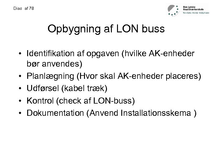 Dias af 78 Opbygning af LON buss • Identifikation af opgaven (hvilke AK-enheder bør anvendes) • Planlægning (Hvor skal AK-enheder placeres) • Udførsel (kabel træk) • Kontrol (check af LON-buss) • Dokumentation (Anvend Installationsskema )